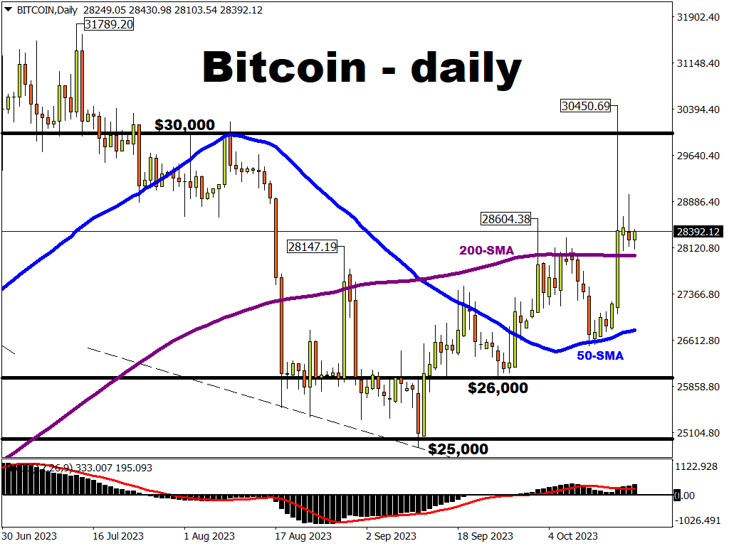 Bitcoin is still keeping its head above the $28k mark, after spiking to a 3-month high earlier this week.
