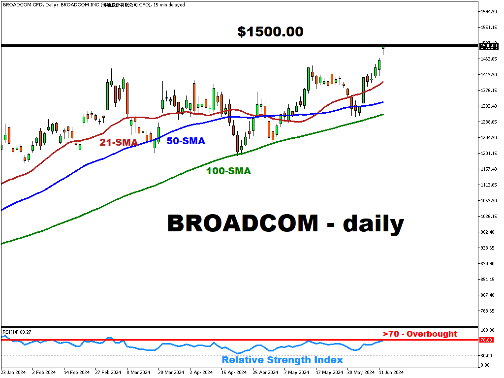 To the upside the briefly touched $1500.00 level is the key short-term target level for the bulls, while to the downside the $1450.00 may provide support if the Broadcom bears try to regain the initiative.