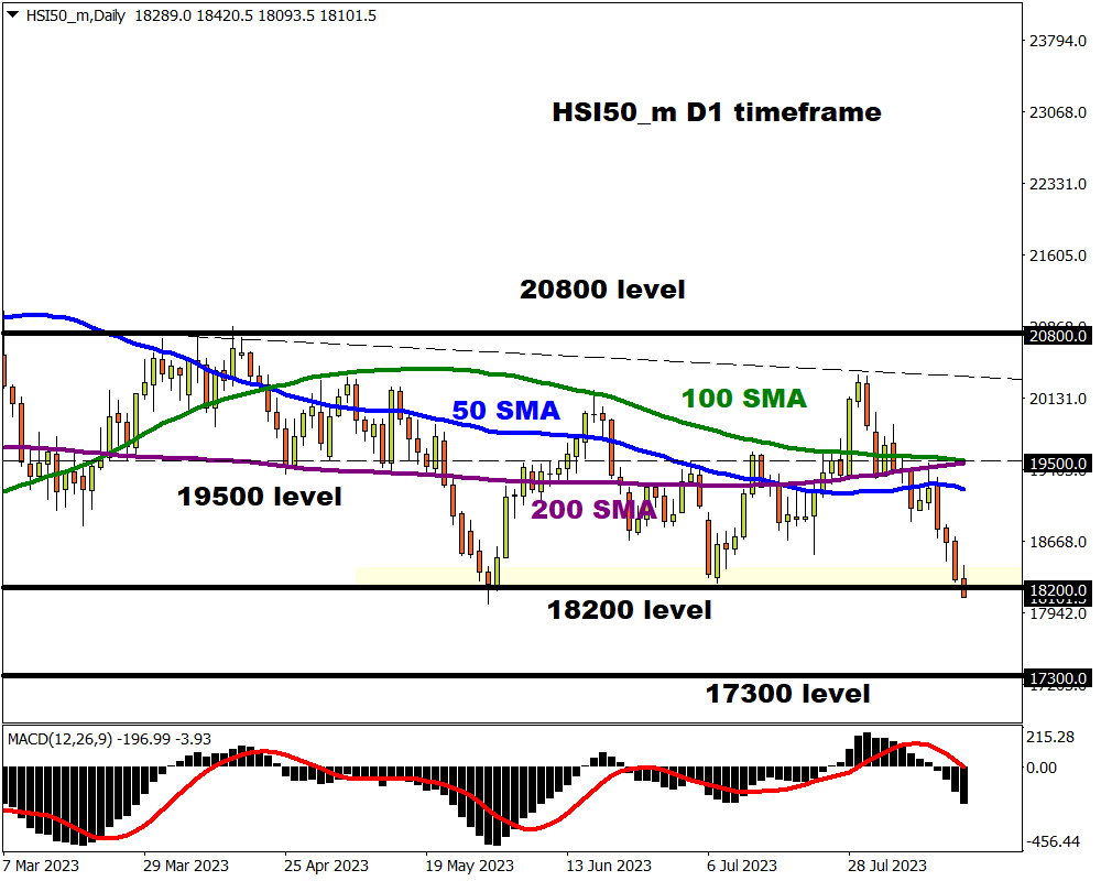 The recent breakdown on the HSI50_m could signal further downside in the short to medium term. Should bears secure a solid close below 18200, this could open a path toward 17300. If prices experience a rebound from 18200, the next key level of interest can be found at 19500 – where the 100 and 200-day SMA reside.