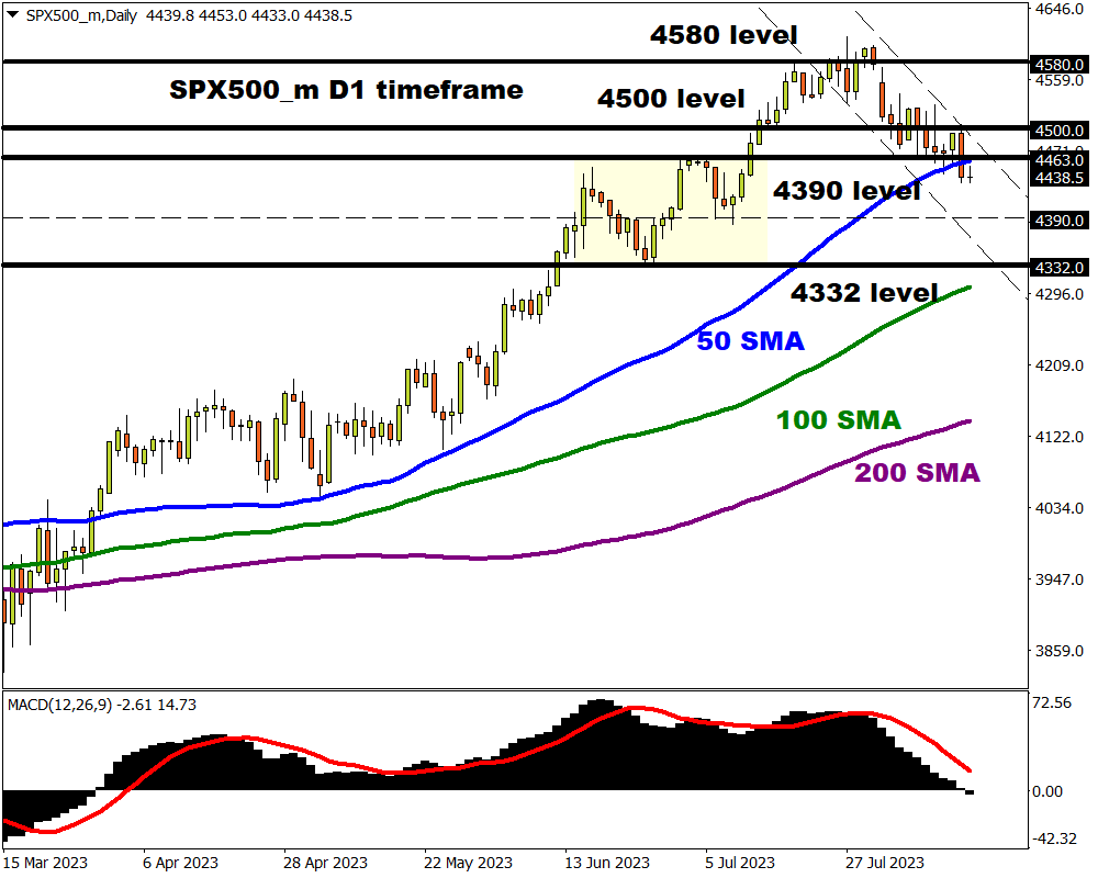The S&P 500 experienced a sharp selloff yesterday, closing below its 50-day SMA for the first time since March. This development could signal further downside with the next key levels of interest at 4390 and 4332, respectively. Should prices push back above 4500, bulls may target 4580.