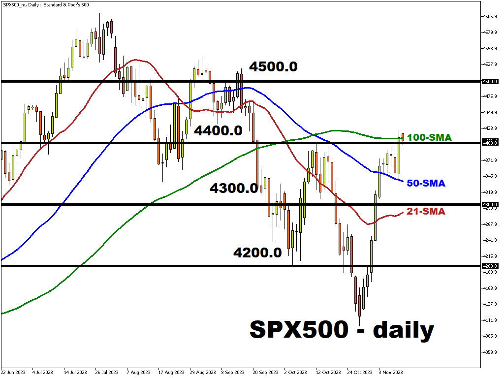 In the current “bad news is good news” environment, an even-steeper decline may bolster bets for Fed rate cuts next year, which could spark further joy among equity bulls to send the SPX500_m higher.