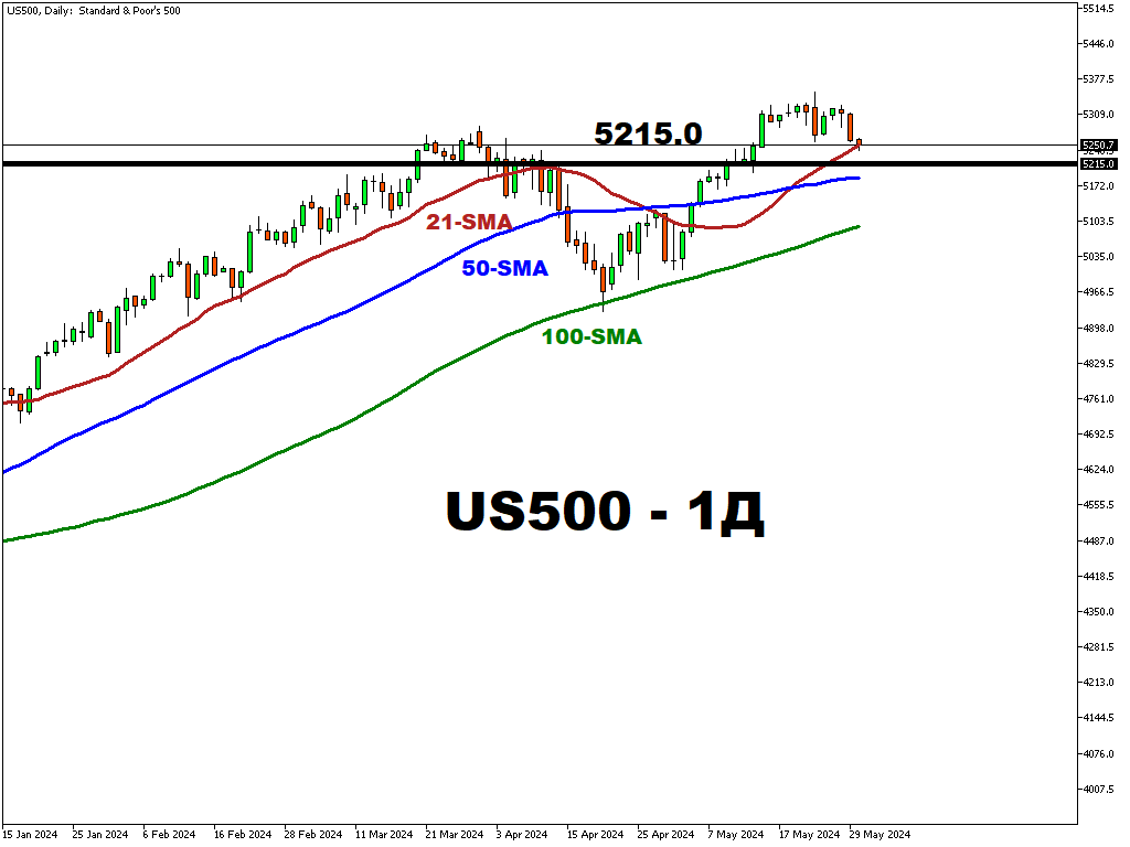 На daily-графике торгов индексом S&P 500 заметно продолжение развития снижения к 5215 п.